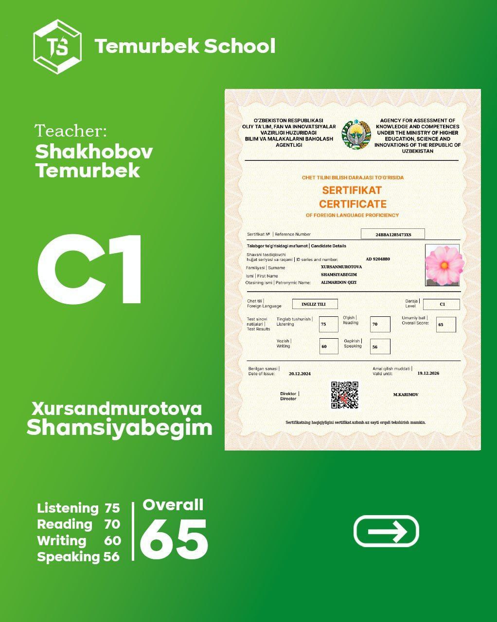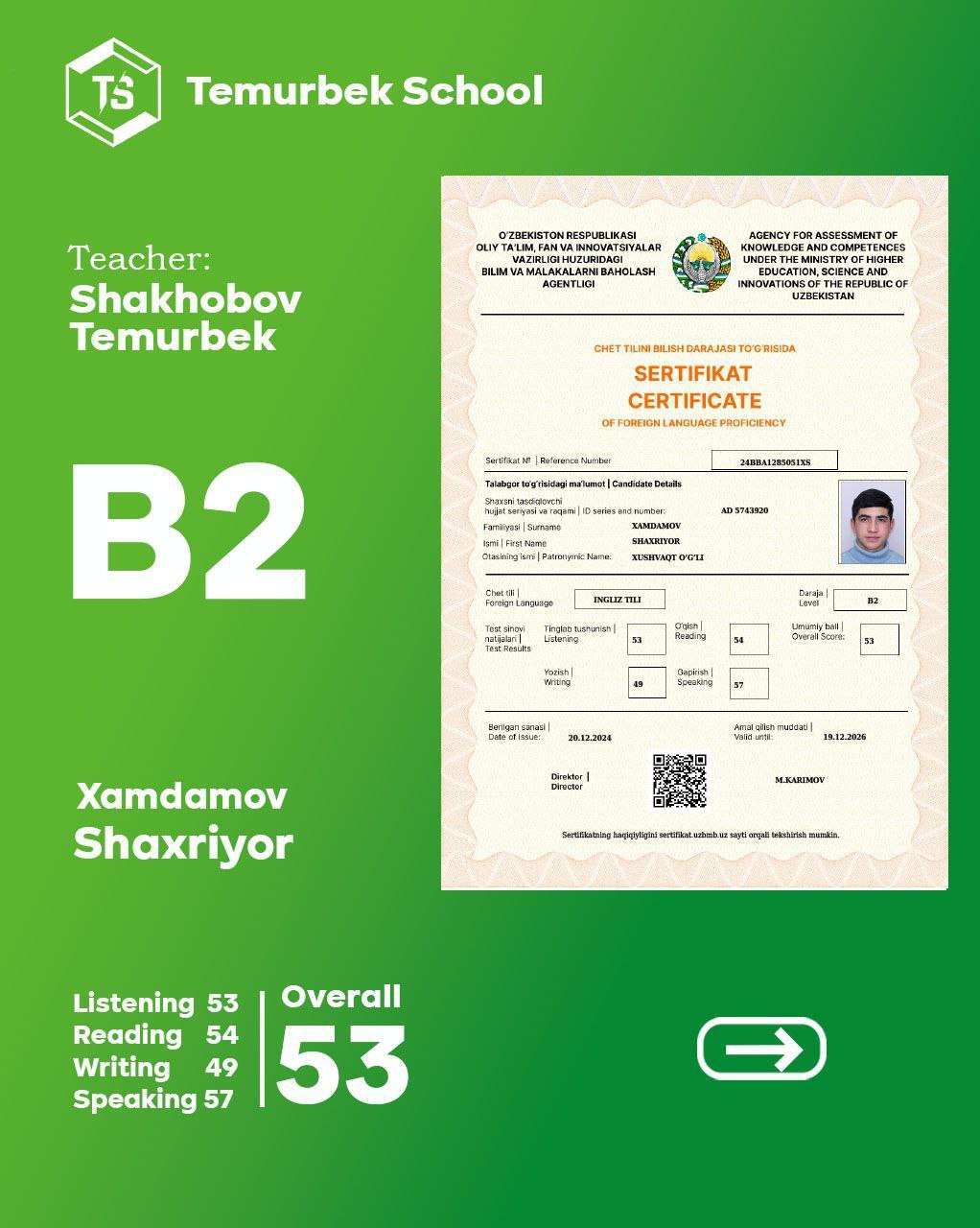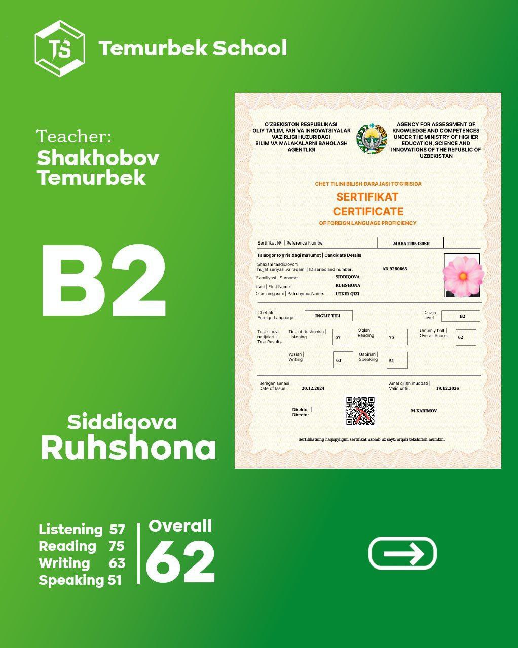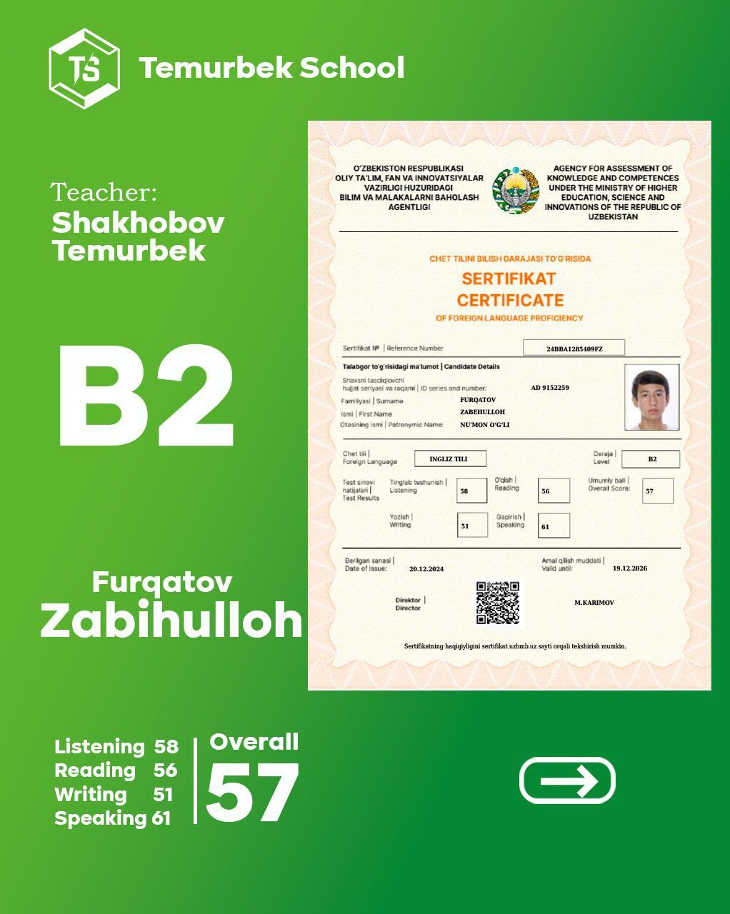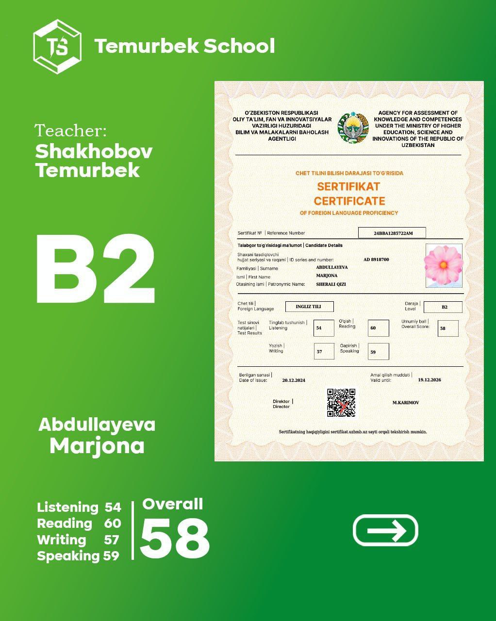 Bizning CEFR Testidan yaxshi nartija erishgan o'quvchilar